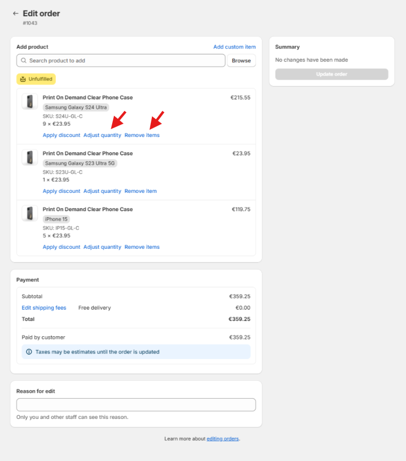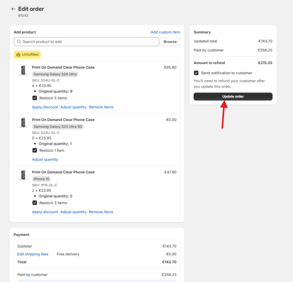 3. After making the changes click "Update order"