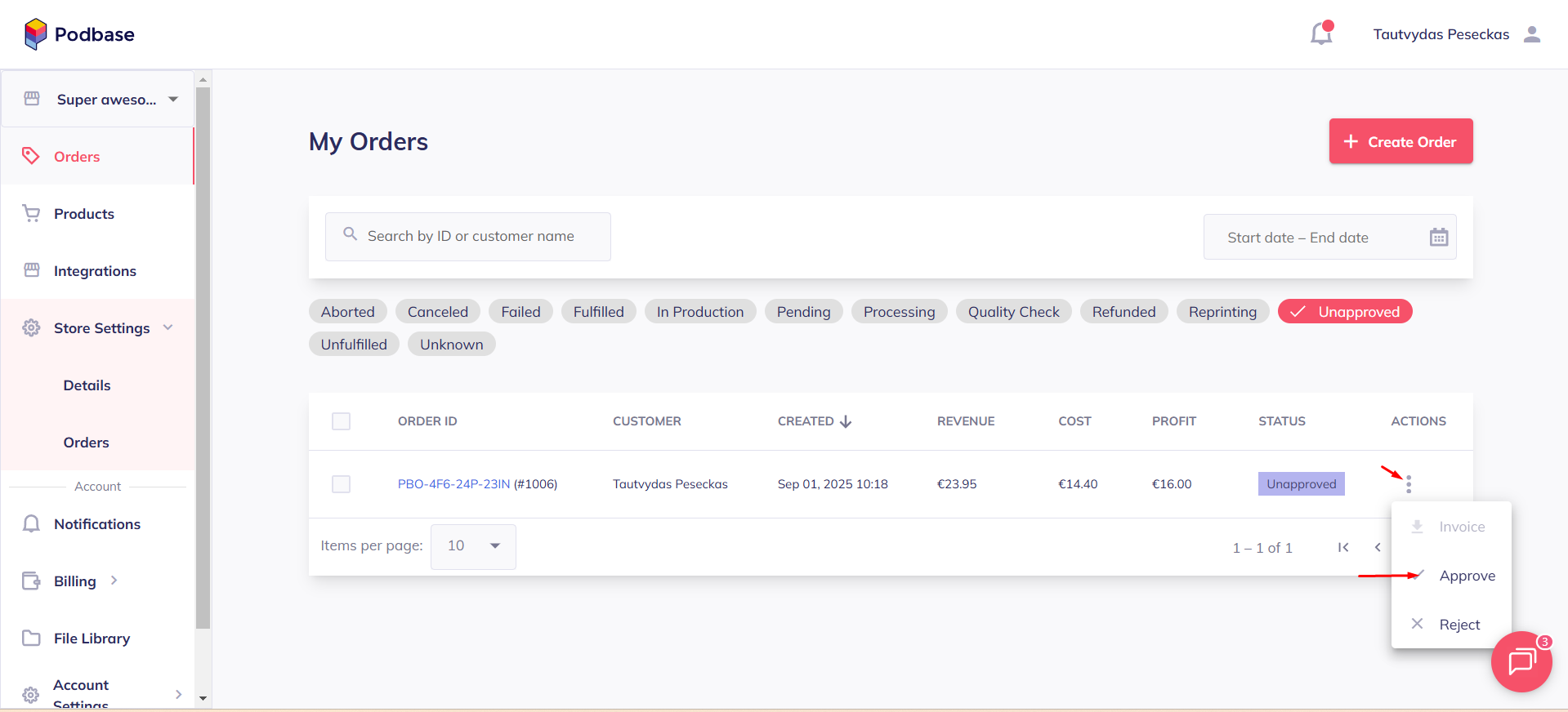 When you get a new order on your Shopify store and have already imported it to Podbase, you’ll see those orders listed with an "Unapproved" status on the Podbase platform.